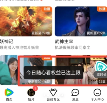 如圖6所示,這是第二天的情況。不清楚獲取到的時長具體是多久,當我想要續時長時,界面顯示“今日隨心看權益已達上限”。要知道,之前還能通過看廣告獲取時長,只是當時我沒完成就退出了。如今免費時長沒了,再點擊相關操作就只顯示“上限”了。