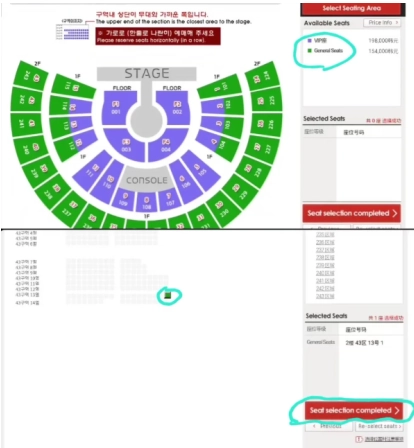4. 選座:第一步需進行人機驗證,驗證完成后,在頁面右側能看到【available seats】,這里有不同價格的座位分類,點擊即可展開選座界面;若使用電腦操作,可通過快捷鍵tab+enter切換選區;當看到座位亮起,點擊該座位,接著點擊【seat selection completed】 。
