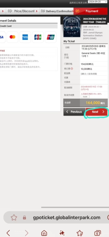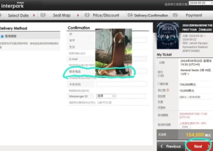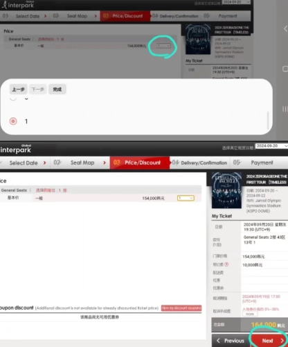 5. 頁面成功跳轉后即為暫時鎖座成功,如果買1張票,則下拉列表中選擇相應票數1,以此類推。完成后點【next】。