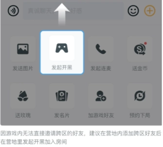 請(qǐng)注意:由于游戲內(nèi)無法直接邀請(qǐng)跨區(qū)好友,建議先在營(yíng)地中添加跨區(qū)好友,然后在營(yíng)地發(fā)起開黑并加入房間。