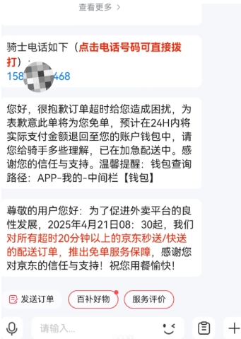 今天點的外賣,都快過去半小時了,一直沒人接單。我點了催單后,發現平臺加了小費才好不容易搖到騎手。結果送到我手上的時候,已經超時40分鐘了,平臺給我送了超時券。我突然想到平臺剛發的公告,就去問了客服,沒想到真的給我申請到免單了!我有點擔心送餐的小哥會被處罰,趕緊問了一下,得到的答復是這算平臺的責任。