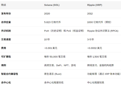 Solana與XRP的主要差異體現(xiàn)在預(yù)期用途及架構(gòu)方面。Solana著重于為去中心化應(yīng)用及區(qū)塊鏈可擴(kuò)展性提供支持,而XRP則著力于對傳統(tǒng)金融系統(tǒng)與銀行間支付進(jìn)行優(yōu)化。這些不同的目標(biāo)致使它們在技術(shù)以及市場定位上出現(xiàn)區(qū)別。