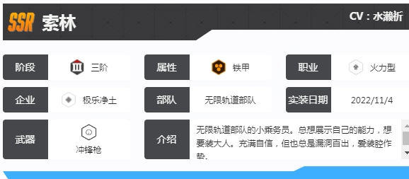 在戰(zhàn)斗進(jìn)程中,索林會彰顯出強(qiáng)大實(shí)力。沖鋒槍射擊屬于常規(guī)攻擊,每次攻擊能對目標(biāo)造成4.68%的傷害。“干練”作為被動技能,歷經(jīng)40次普通攻擊后,可提升自身攻擊速度。“成熟”是另一被動技能,當(dāng)自身處于滿體力狀態(tài)時,能夠提升暴擊傷害與暴擊率。“我也行”為主動技能,擁有40秒的冷卻時間,可對范圍內(nèi)所有敵人造成傷害。