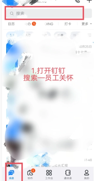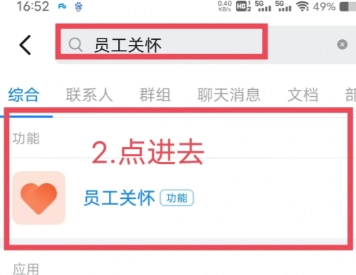 1. 打開釘釘軟件,在搜索欄中輸入“員工關(guān)懷”,然后點擊進入。