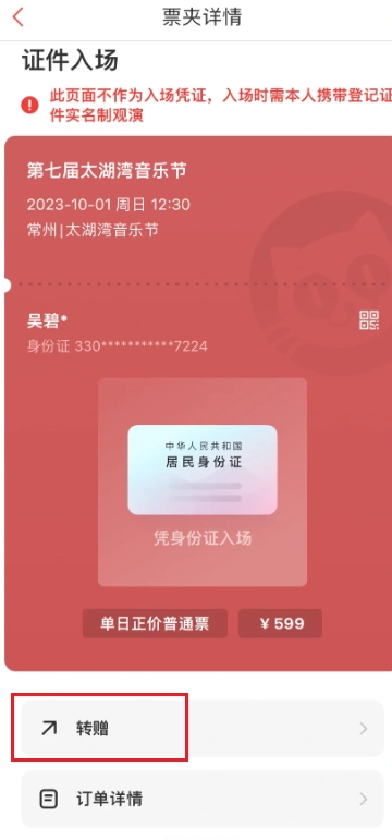 1. 打開貓眼APP,點擊“我的票夾”,選中你打算轉增的票,進入相關頁面后,點擊下方的“轉增”。剛開票時,部分票可能沒有轉增按鈕,這種情況下,大家稍等一會兒,待轉贈功能開啟即可。