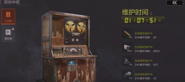 領地柜具備一鍵升級功能,玩家可在此放置與建筑相關的材料,后續便能將其升級為自己所需的材料,極大地節省操作時間。建筑物遭受腐蝕后,耐久度會逐漸降低,而領地柜的材料能有效減緩腐蝕,實現更好的保存效果。