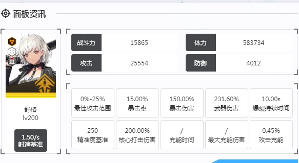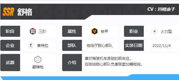 從技能角度而言,舒格擁有諸多技能。像黑色臺風,便是實用性頗佳的被動技能。掩體遭受攻擊后,會有20%的觸發(fā)概率,不僅能使自身暴擊傷害有效提升9.68%,還具備持續(xù)10秒的優(yōu)勢。黑色感測器同樣是被動技能,全爆裂啟動時,可將自身暴擊率有效提高18.5%,能為所有隊友帶來優(yōu)勢。
