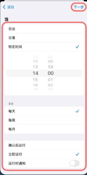 3. 在快捷指令里創建一個自動化,設置其每天14點運行,務必勾選“立即運行”選項,隨后添加剛才獲取到的快捷指令。此步驟旨在讓該快捷指令每天下午兩點執行一次。