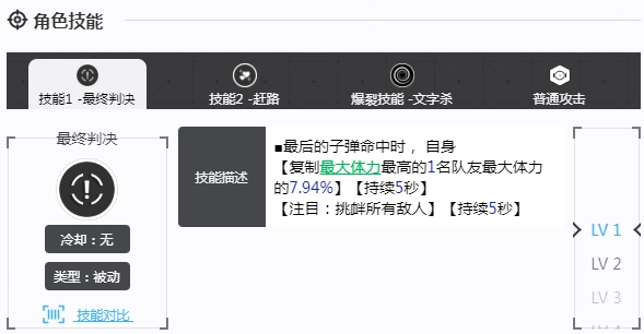 最終判決是一項實用性技能,當最后一顆子彈命中時,能直接復制體力最高隊友的部分體力,且該效果持續5秒。此技能意味著在戰斗過程中,玩家可盡情吸引敵人火力,同時獲得較好的生存保障,進而帶來顯著的輔助優勢。