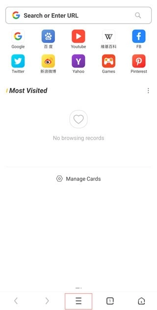 1、啟動UC瀏覽器國際版,點擊主頁底部導航欄上的三條橫線“菜單”圖標。