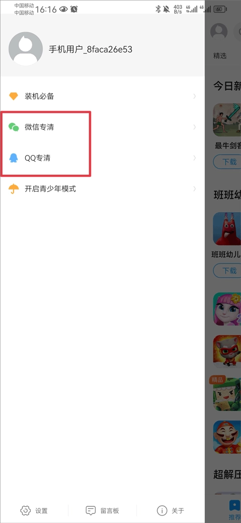 3、點擊左上角可以進入個人中心界面,用戶可以為微信,qq進行垃圾清理