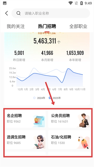1、在首頁功能區點擊【看就業】按鈕,即可進入就業相關板塊查看招聘信息。
