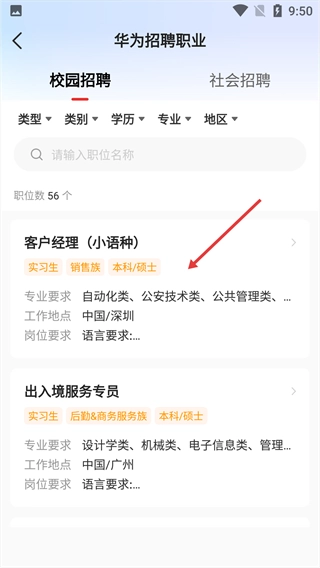 4、通過類型、學歷等篩選條件,查看相關職位的要求。