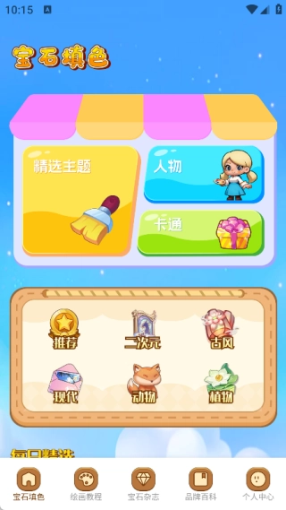 1、寶石填色頁面涵蓋了精選主題、人物、卡通等類別,此外還有推薦、二次元、古風、現代、動物以及植物等分類。