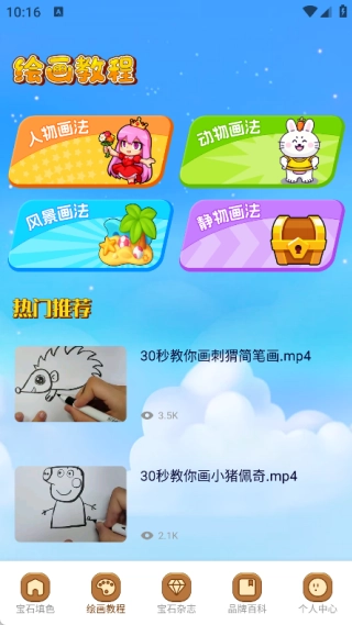 2、在繪畫教程頁面中有人物畫法、動物畫法、風景畫法、靜物畫法,還有各種熱門推薦;
