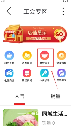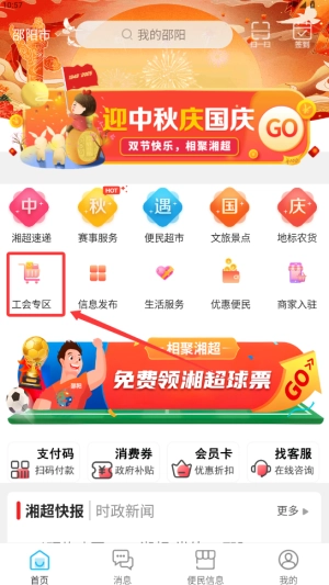 1、在首頁點(diǎn)擊工會(huì)專區(qū),進(jìn)入邵陽同城服務(wù)。