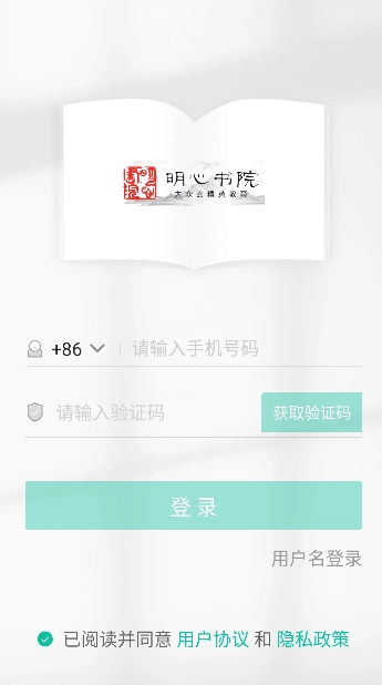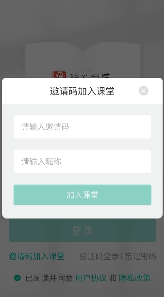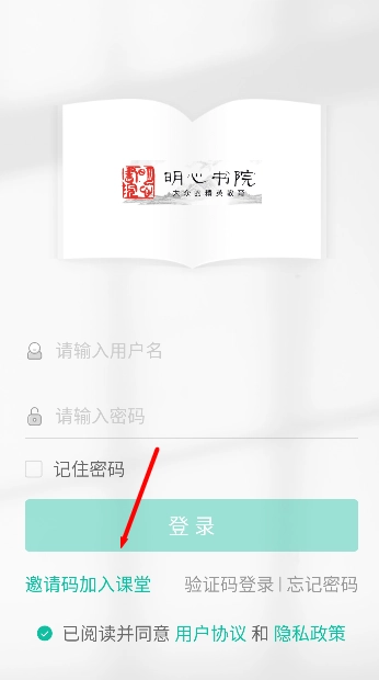 1、打開《明心書院》應用,在首頁找到并點擊“使用邀請碼進入課堂”選項,即可跳轉至課堂登錄與驗證頁面。