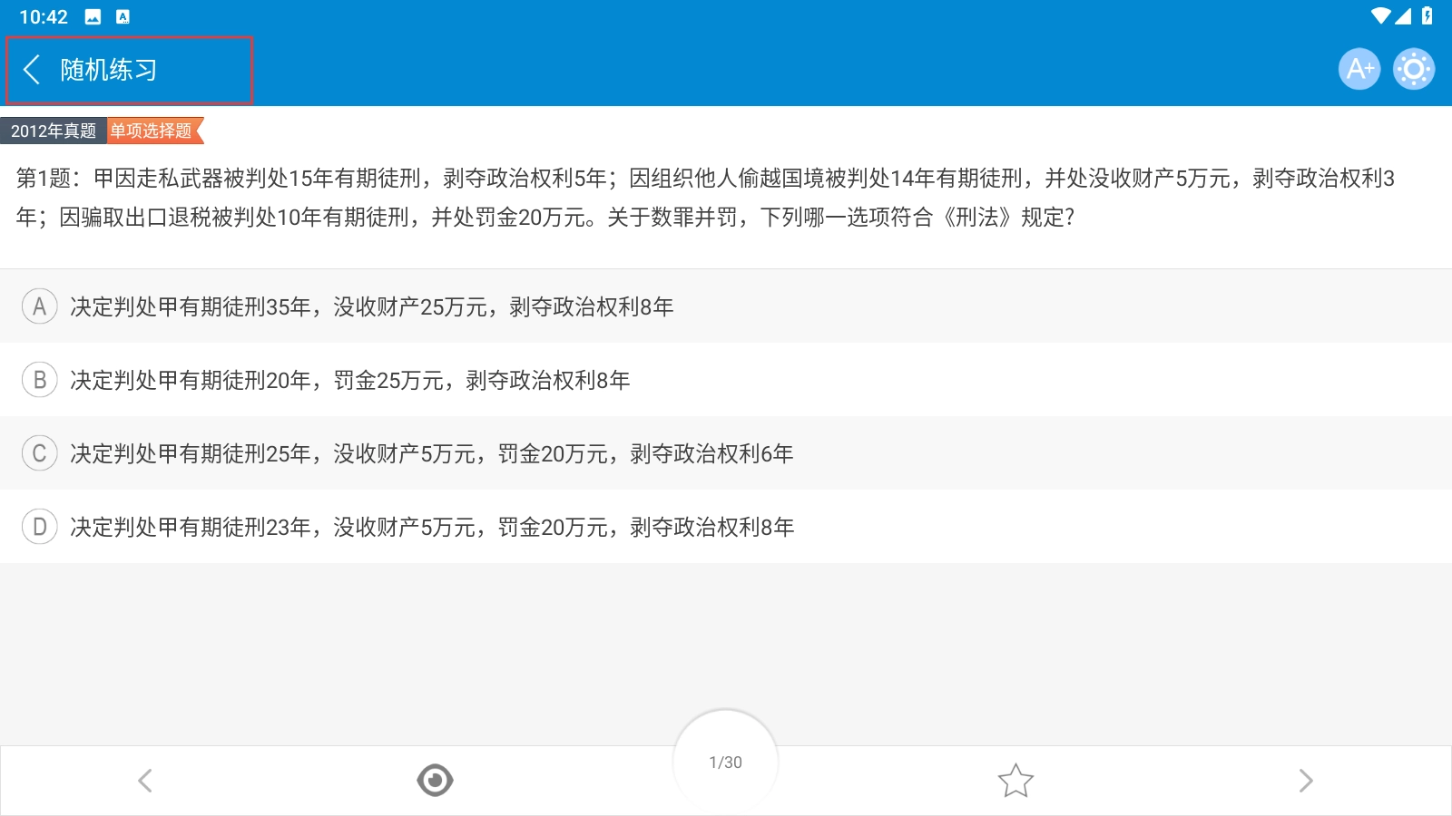 3、進入【隨機練習】,可做真題(如2012年刑法題),按頁面指引答題練習。