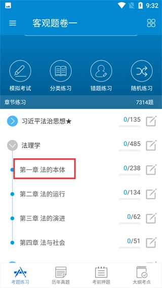 2、打開【法理學】板塊后,會呈現出各個細分章節,像【第一章-法的本體-0/238】這樣的形式,大家可以根據自身需求挑選對應的章節來做練習。