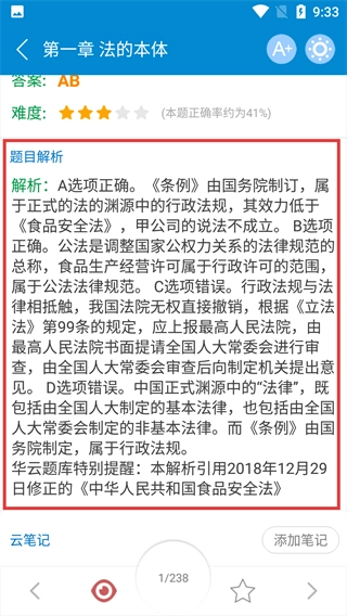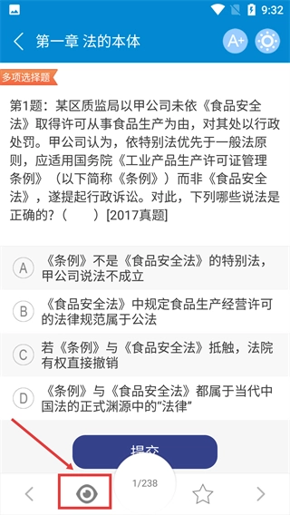 3、進入【第一章-法的本體】的題目頁面后,點擊底部的眼睛圖標就能查看題目解析,這樣便于了解答題的對錯情況。