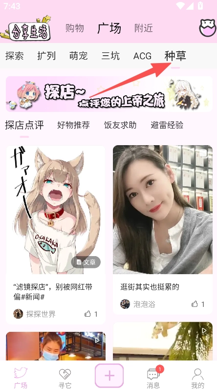 1、打開軟件進(jìn)入廣場頁面,選擇探索或萌寵等分類。