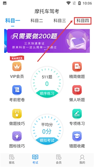 1、在【摩托車駕考】界面,點擊頂部的【科目四】選項卡,就能切換到科目四練習板塊。