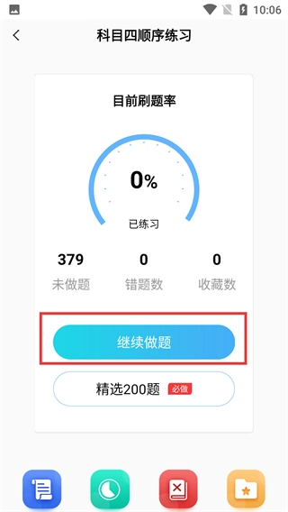 3、進入【科目四順序練習】頁面后,點擊【繼續做題】按鈕,即可開始科目四的題目練習。