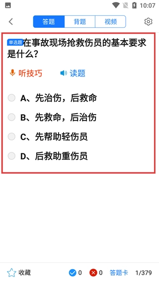 4、進入科目四答題頁面后,在解答【單選題】的過程中,可以利用【聽技巧】和【讀題】這兩個功能;當前顯示的是【1/379】題,完成該題后能夠繼續切換到下一道題目。