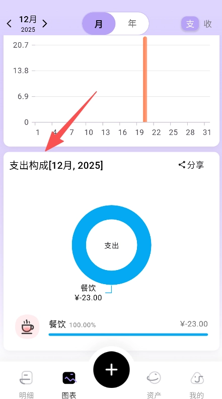 2、進入圖表板塊,查看支出構成及本月收支、結余情況。