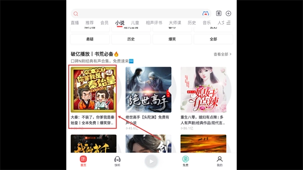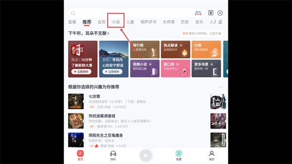 1、點擊首頁的【小說】分類標簽,即可進入有聲小說專區。