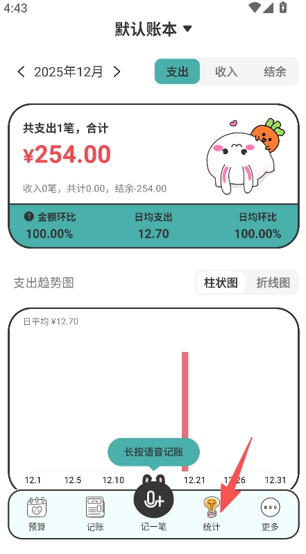 1、打開軟件點擊統(tǒng)計板塊,查看支出收入結(jié)余等匯總數(shù)據(jù)。