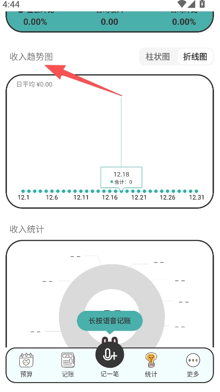 2、在統(tǒng)計頁面切換月度年度查看,選擇趨勢圖的柱狀圖或折線圖類型。