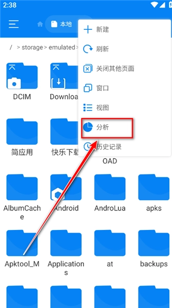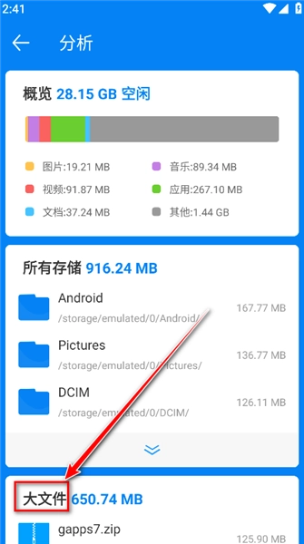 3、之后會彈出窗口,我們點擊分析解開查看當前占用手機存儲空間最大的文件夾以及所有大文件,方便用戶對無用的大文件進行管理刪除操作(建議刪除前點擊查看是否為需要的文件)
