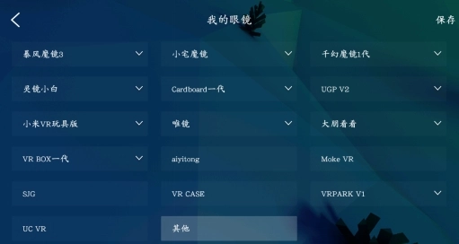 3、選擇VR眼鏡:在“眼鏡選擇”界面中,軟件會列出兼容的市面上大多數主流VR眼鏡。你需要從中選擇一款你已經擁有或者打算使用的VR眼鏡,并進行保存設置。
