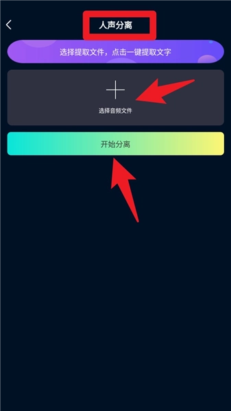 2、選擇「人聲分離」功能,上傳音頻文件后點擊底部的「開始分離」按鈕,系統將自動識別并提取人聲軌道。