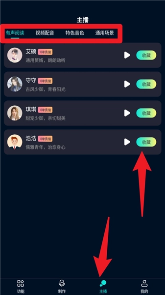 4、要是想要更換聲音風格,可以進入「主播」頁面,在有聲閱讀、特色音色等不同分類里挑選并收藏自己喜歡的主播。