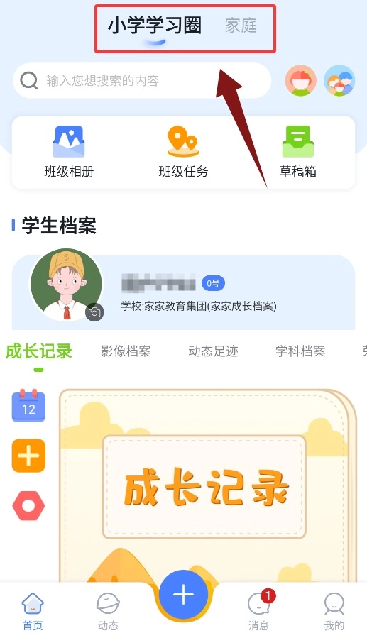 2、首頁設有小學學習圈、家庭互動等專屬學習社區入口。