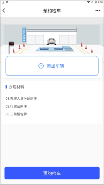 3、錄入車輛相關信息,此外還需準備辦理人的身份證原件、行駛證原件以及三角警告牌,完成這些操作后點擊預約檢車按鈕即可。