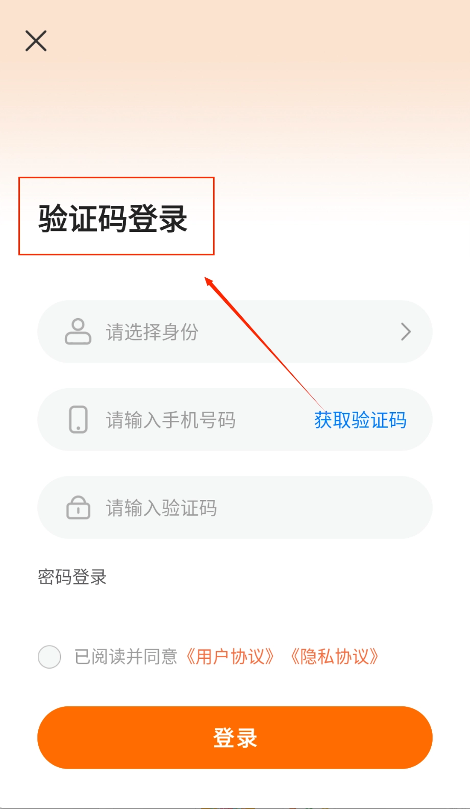 2、要是用驗證碼登錄呢,輸入手機號后點獲取驗證碼,等短信來了填進去就行,別忘了勾選同意用戶協議哦。