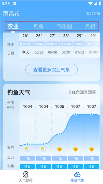 5、最后點(diǎn)擊右側(cè)的綜合天氣板塊,這里涵蓋了農(nóng)業(yè)、釣魚、氣象圖以及月相等各類實(shí)用且有趣的天氣與氣象相關(guān)信息,能夠滿足不同用戶的多樣化需求。