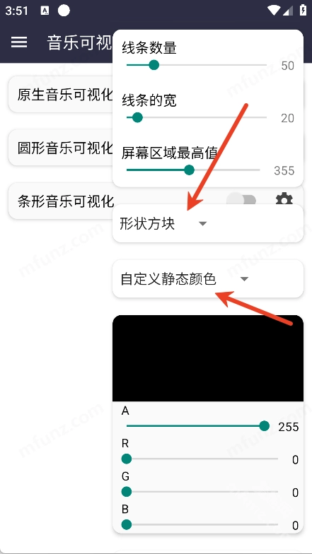音樂可視化安卓版有著簡潔的界面,操作方式也十分簡單,它就像音樂播放器里的一個小插件,你可以根據個人喜好挑選音樂可視化模式,而且每種模式都能自定義調整變化速度、尺寸以及顯示的屏幕區域,從而打造出更具個性化的音樂播放體驗!