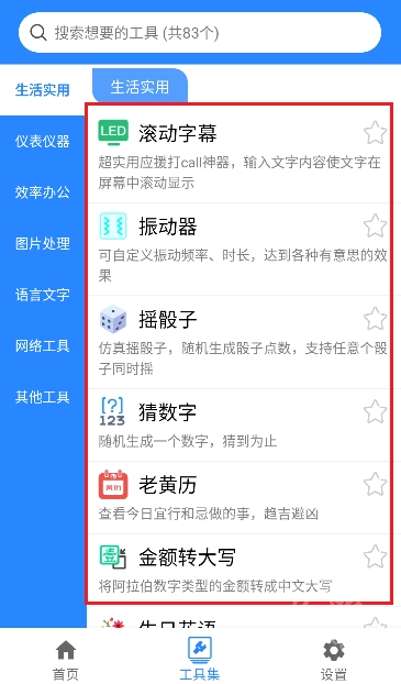 整合了生活、辦公、圖片、網(wǎng)絡(luò)等8大類工具,讓用戶無需使用多個獨立應(yīng)用。