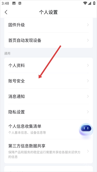 3、在【個人設置】頁面,選擇【賬號安全】選項。