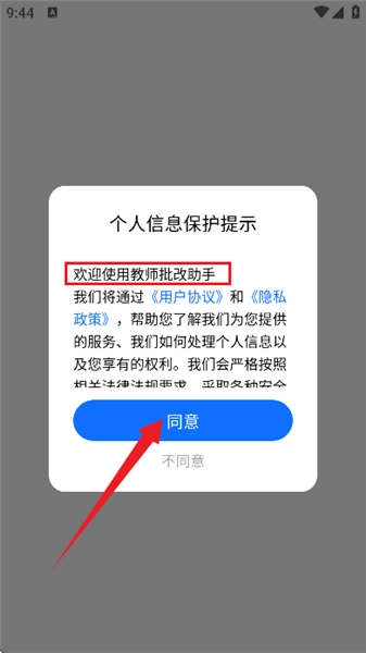 2、進到軟件首頁,如圖所示,首先請同意用戶協(xié)議和隱私政策。