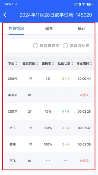 4、完成批改后就能獲取學情數(shù)據(jù),軟件會對統(tǒng)計后的這些數(shù)據(jù)加以展示,方便用戶查看。