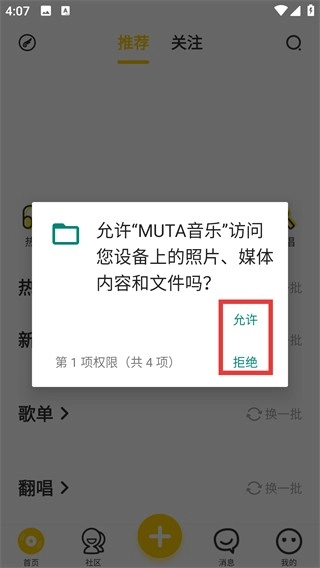 1、當(dāng)MUTA音樂(lè)彈出權(quán)限請(qǐng)求窗口時(shí),點(diǎn)擊【允許】按鈕,同意應(yīng)用獲取設(shè)備照片與媒體內(nèi)容的訪問(wèn)權(quán)限,隨后即可進(jìn)入應(yīng)用首頁(yè)。