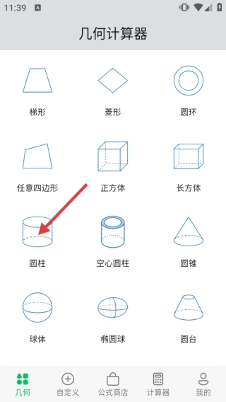1、啟動幾何計算器軟件,在幾何界面中點擊【圓柱】圖標,即可進入圓柱計算頁面。