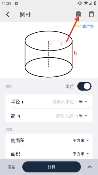2、在圓柱計算頁,點擊右上角帶鍵盤圖標的按鈕,可進行數據輸入相關操作。