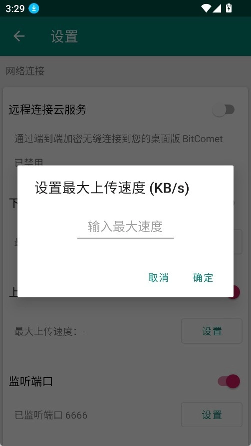 4、在彈出的設置最大上傳速度頁面中,輸入您期望的最大上傳速度數值,最后點擊“確定”按鈕就完成了。