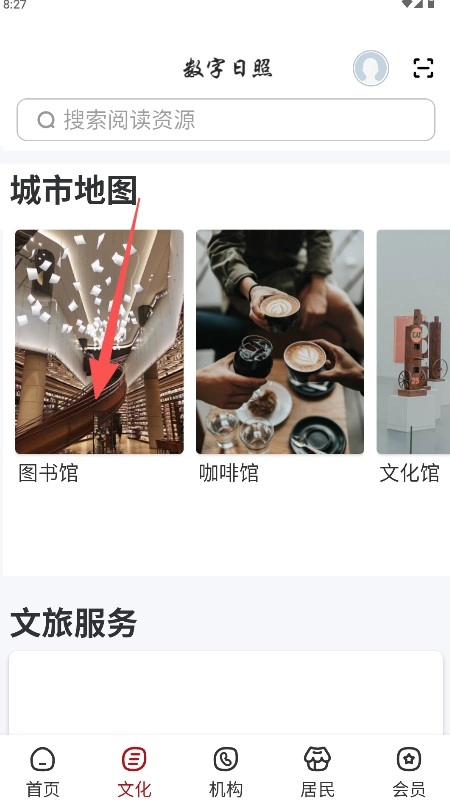 1、在文化頁(yè)面的“城市地圖”點(diǎn)擊“圖書(shū)館”進(jìn)入機(jī)構(gòu)列表頁(yè)面。